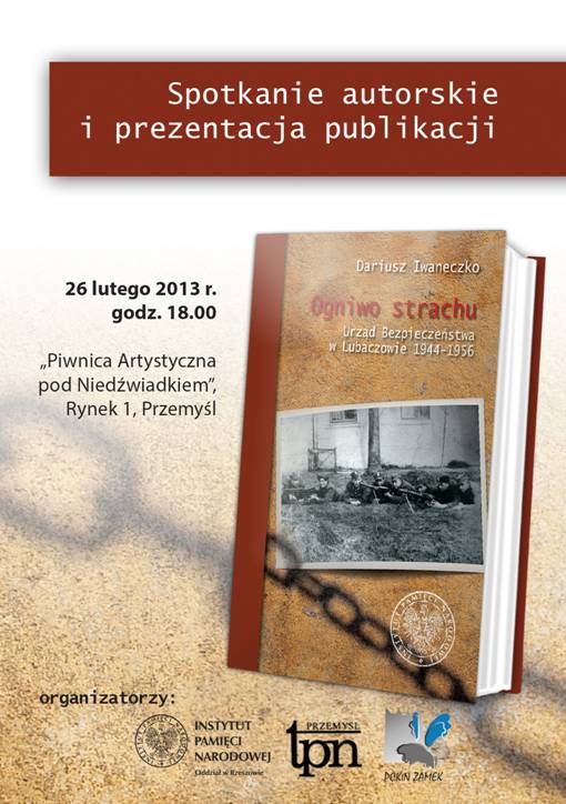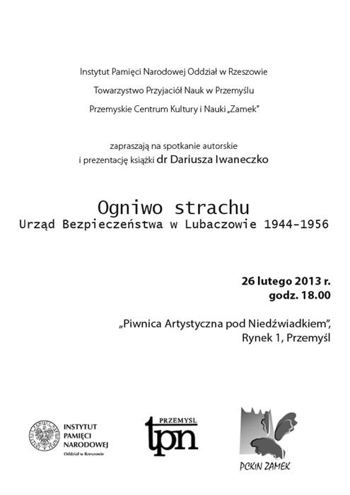 Towarzystwo Przyjaciół Nauk w Przemyślu Przemyskie Centrum Kultury i Nauki ZAMEK zapraszają na promocję książki Katarzyny Trzeciak Figury pożądania, figury pisania w wybranych nowelach Stefana Grabińskiego Prowadzenie: Oskar Ostafin (Kraków) Czytanie fragmentów prozy: Barbara Sobol-Pich, Tomasz Pudłocki Prelekcja autorki pt. Grabiński contra czytelnik, czyli po co dziś czytać prozę Stefana Grabińskiego? 7 marca 2013 r. (czwartek) o godz. 18:00 „Piwnica Artystyczna pod Niedźwiadkiem” (budynek Urzędu Miejskiego, wejście od ul. Ratuszowej, przy pomniku Jana III Sobieskiego)